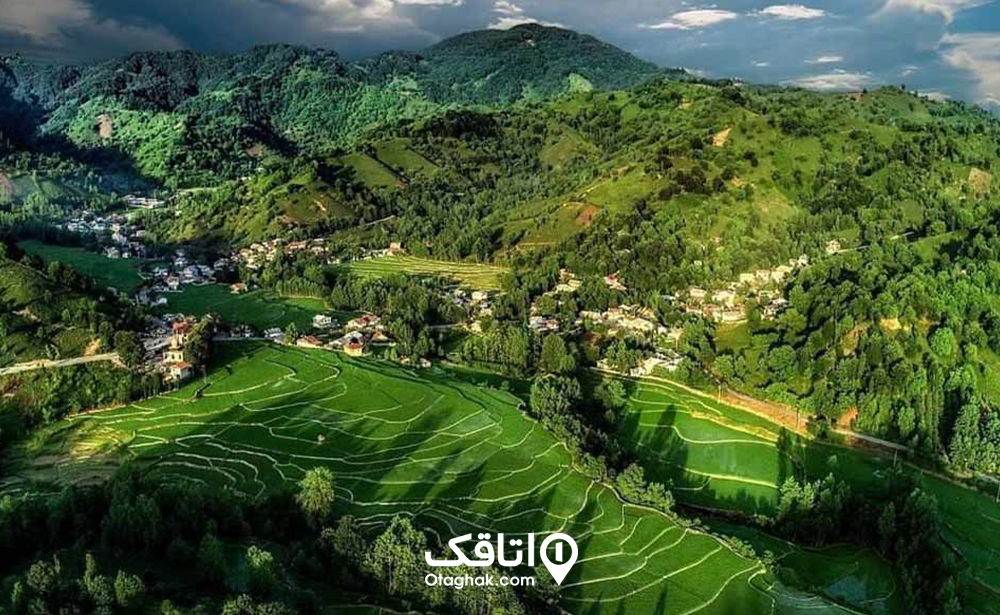 روستایی آرام با مزارع برنج و چای و بقعه دو برادران بر فراز تپه‌ها که ترکیبی از طبیعت و آرامش است.