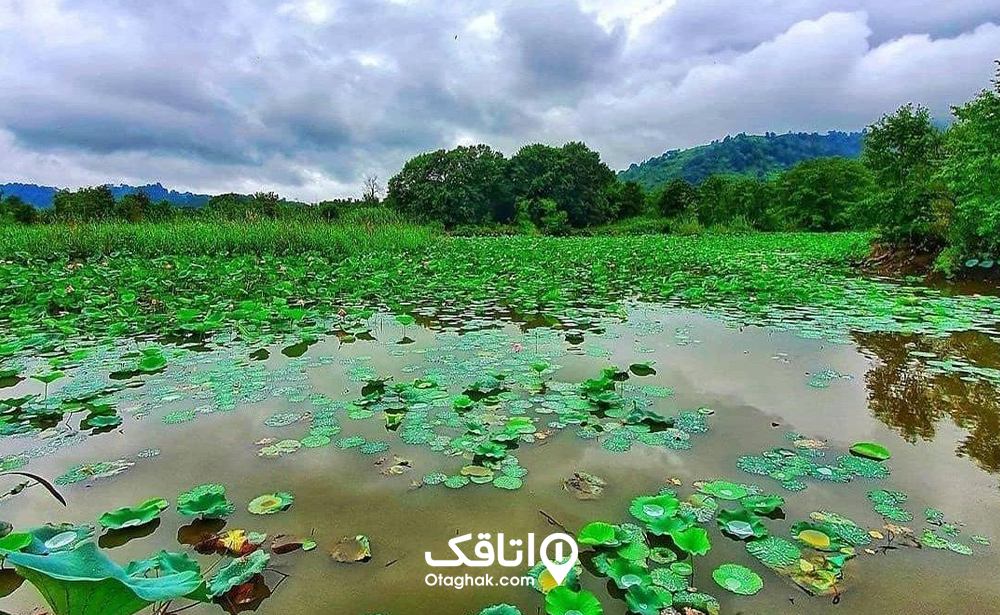 روستایی با تالاب نیلوفرهای آبی، تپه‌های سرسبز و باغ‌های چای که تصویری آرام و متفاوت از طبیعت لاهیجان ارائه می‌دهد.