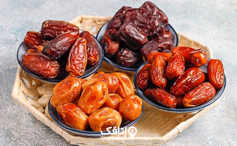 خرماهای مجاهدی، برحی و خاسویی با رنگهای متنوع و بافت نرم؛ شیرینی طبیعی و سالم، قابل حمل آسان. |