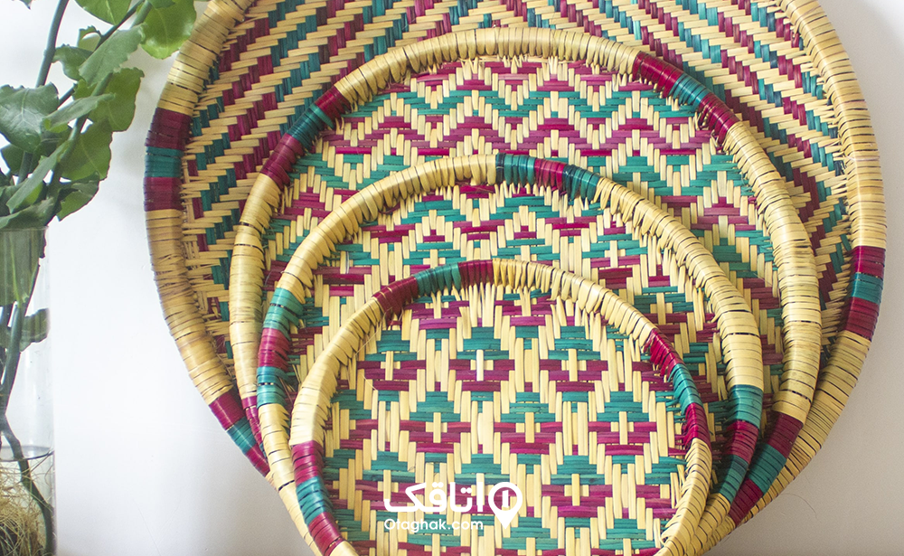 سینیهای حصیری سبک و مقاوم، ساختهشده از برگ نخل و نی؛ کاربرد اصلی برای نگهداری نان و هدیهای ارزشمند از هنر زنان لاری. |